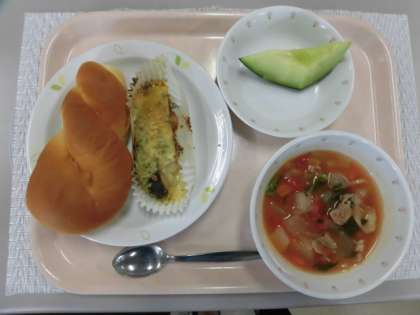 ミルクパン 牛乳 魚のパン粉焼き ミネストローネ くだもの(タカミメロン)