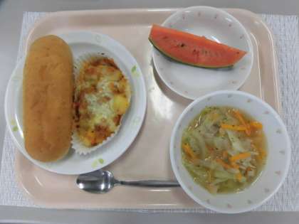 セサミパン 牛乳 ポテトグラタン 千切り野菜スープ くだもの(小玉すいか)