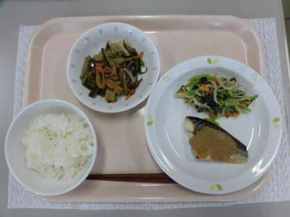 ごはん 牛乳 魚のごまみそかけ くきわかめの金平 野菜のからしじょうゆかけ