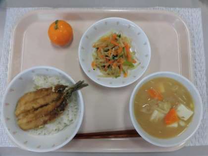 いわしのかば焼き丼 牛乳 切干し大根のみそ汁 糸寒天と野菜のあえ物 くだもの(冷凍みかん)