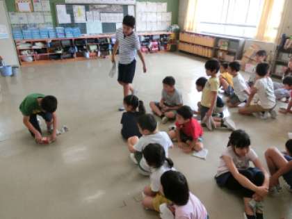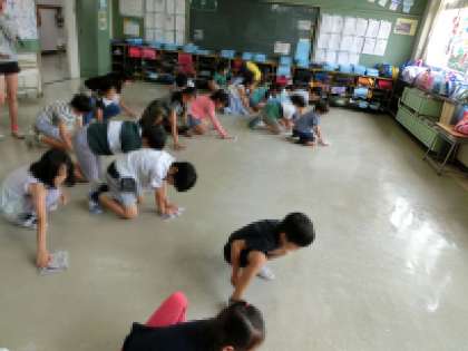 6年生が低学年に対して、雑巾の絞り方や床の拭き方などを教えて、教室の大掃除です。