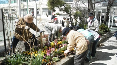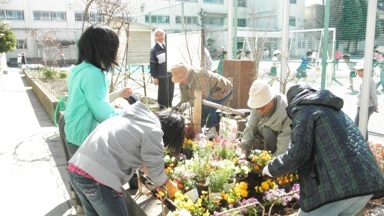 瀬田町会のご協力をいただいて、水琴窟近くの花壇に春の花を植えていただきました。飛び入りで6年生の心やさしい子も協力してくれました。春色に染まったふれあいガーデンをご覧いただき、春を感じてください。