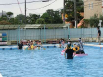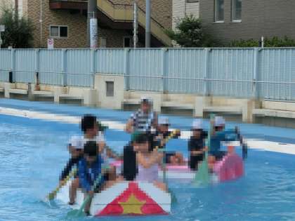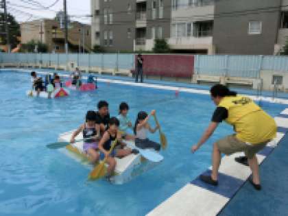 「アドベンチャー in 多摩川」に向けて、使用するいかだの進水式をプールで行いました。