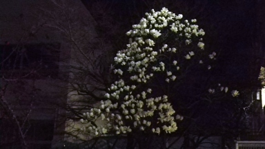 桜よりも一足先に咲き誇る白モクレンが見事に咲いています。夜になるとやわらかい月の光を浴びて、昼とは違う美しさを見せてくれます。