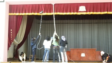 3月11日(金)に体育館のワックスがけをしましたが、その後の地震の影響ですっかり汚れてしまいました。そこで、PTA本部役員の皆さんが中心になり、午後の時間を使って目いっぱいきれいにしていただきました。子どもたちでは、掃除できないような箇所まできれいにしていただきました。汚したらばちがあたります。