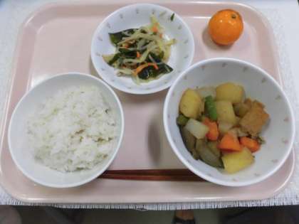 麦ごはん 牛乳 筑前煮 野菜のからしじょうゆかけ くだもの(冷凍みかん)