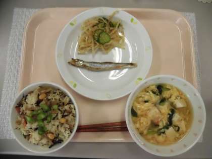 豆入りひじきごはん 牛乳 焼きししゃも かきたま汁 もやしときゅうりのごま風味