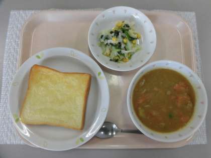 ガーリックトースト 牛乳 カレーシチュー キャベツとほうれん草のサラダ