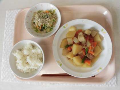 米:山形県 じゃがいも:北海道 玉ねぎ:北海道 にんじん:北海道 さやいんげん:青森県 小松菜:東京都 キャベツ:群馬県 きゅうり:茨城県 ちりめんじゃこ:タイ 豚肉:千葉県