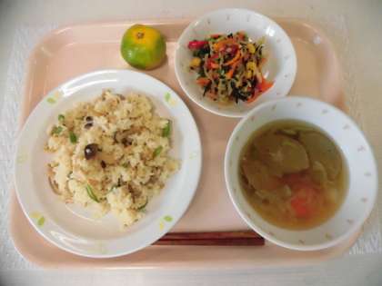 きのこごはん 牛乳 いわしのつみれ汁 大根とひじきのサラダ くだもの(みかん)