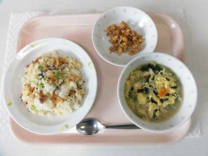 中華菜飯 牛乳 にらたまスープ 大豆とじゃこの甘辛揚げ