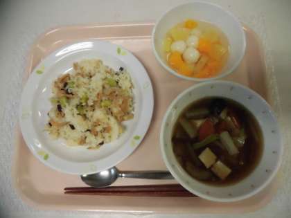 まめまめおこわ 牛乳 けんちん汁 フルーツ白玉
