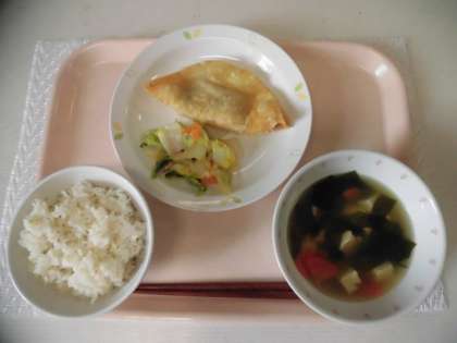 麦ごはん 牛乳 ジャンボぎょうざ わかめスープ 辣白菜(ラーパーツアイ)