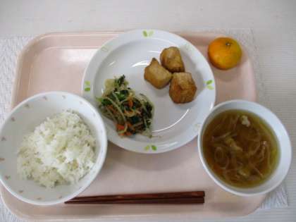 麦ごはん 牛乳 厚揚げのふくめ煮 沢煮椀 野菜のごまあえ くだもの(みかん)