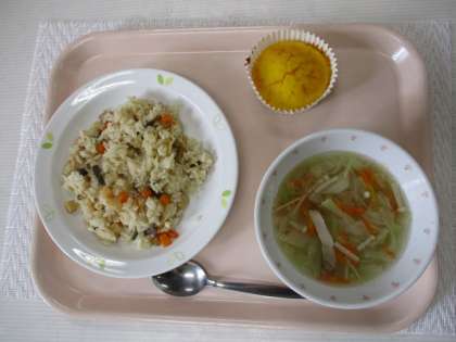 山菜ピラフ 牛乳 えのきたけと野菜のスープ かぼちゃのケーキ