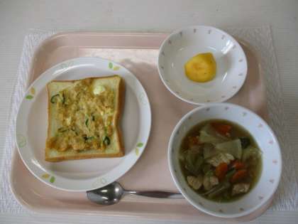 ツナトースト 牛乳 スコッチブロス(大麦とレンズ豆のスープ)くだもの(柿)