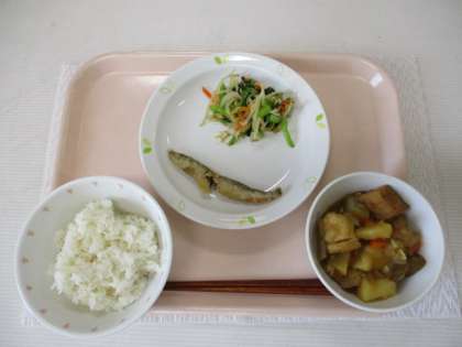 麦ごはん 牛乳 ししゃものから揚げ 五目うま煮 野菜のからしじょうゆかけ