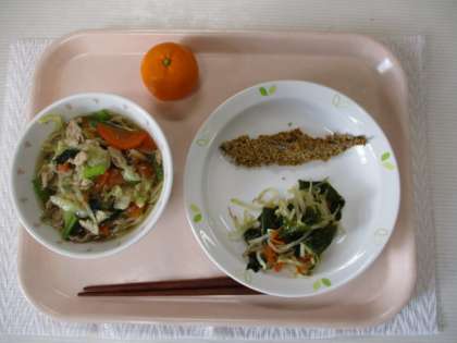 たんめん 牛乳 ししゃものごま焼き 野菜とわかめのからしじょうゆかけ くだもの(みかん)