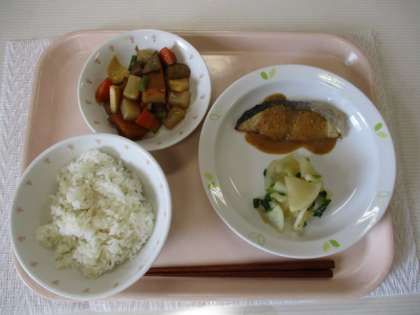 麦ごはん 牛乳 魚のごまだれかけ 五色煮 かぶの浅漬け