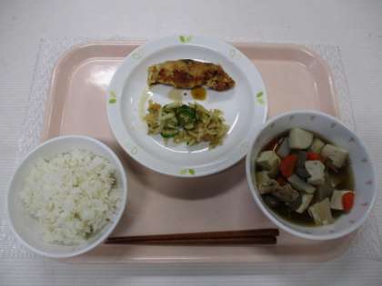 麦ごはん 牛乳 魚の東煮 けんちん汁 切干し大根ときゅうりの甘酢和え