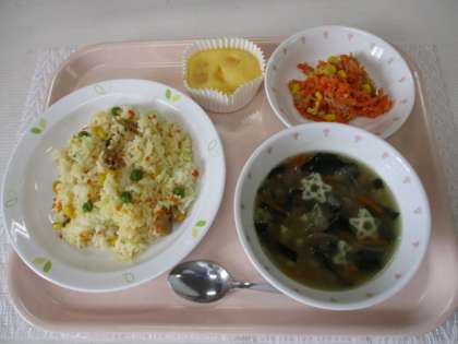 三色ピラフ 牛乳 ほうれん草とマカロニのスープ キャロットラペ(にんじんのサラダ) 黄桃のヨーグルトケーキ
