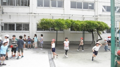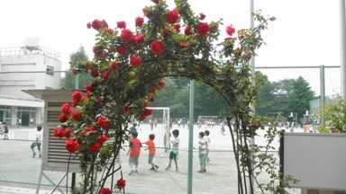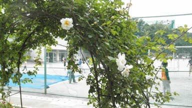 校庭の藤の木は開花時期が終わり、たくさんの葉をつけるようになりました。次に咲き始めたのが紅白のバラです。現在はやや赤の方の花が多いのですが、運動会のときはどうでしょうか。