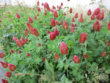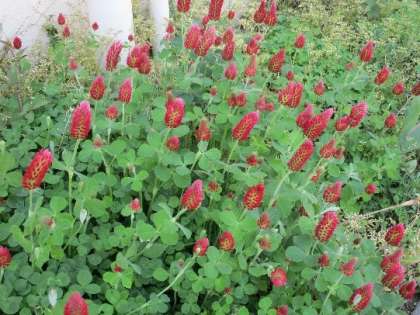 この花の名前は、ベニハナツメクサ、別名クリムソンクローバーといいます。花言葉は、「やくそく、そぼくなかわいらしさ」です。赤いぶぶんは、何かの食べ物に見えませんか。