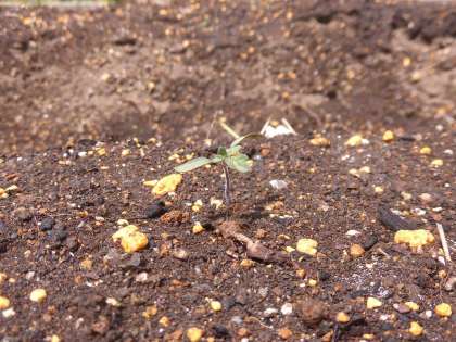 今、2年生のはたけでは、夏やさいの「ミニトマト」をうえています。4月のおわりに たねをまいて、今は、めが 出てきています。