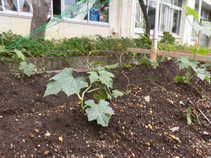 今週の月曜日、主事さんに手伝っていただき、4年生の畑に8つのヘチマの苗を植えました。