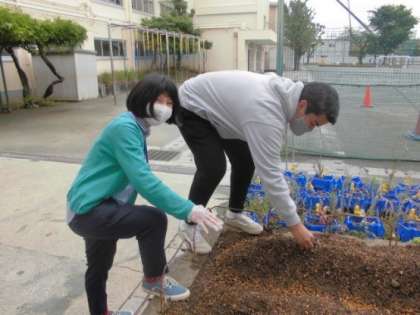 今週は、学年の先生全員でひまわりの種を植えました。
