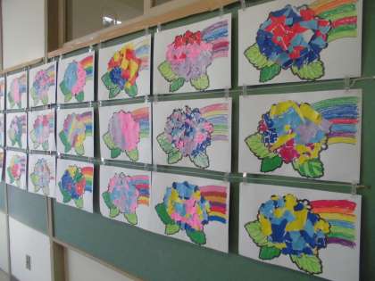 通常登校になり、1週間連続での登校を初めて経験した1年生!新しい友達も少しずつでき、教室もにぎわいを見せています。図工では、季節の花、あじさいをテーマに色塗りを楽しんだり、ちぎり絵にしたり、作品作りを楽しみました。