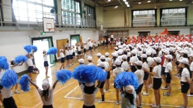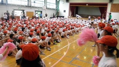 台風の影響で5月28日(土)に運動会を予定していた学校は、翌日も雨だったため明日に延期しています。今朝もまだ雨が続いていたため、児童朝会の後、全体練習は体育館で行いました。開会式や閉架式、応援の練習をしました。各係とも今日の練習のためによく準備していたため、進行はスムーズでした。特に応援の係は、全校の応援をリードする立派な心構えで練習に臨んでいました。
