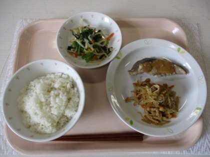麦ごはん 牛乳 魚のごまだれかけ 切り干し大根の煮付け おひたし
