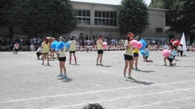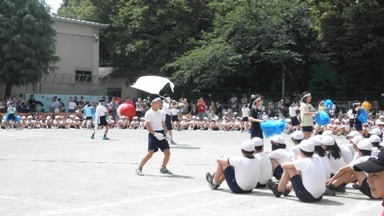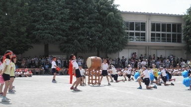 午前の部は、準備運動から始まり次に応援合戦をします。応援団は、自分たちだけでなく全校児童にはたらきかけ、運動会への雰囲気を盛り上げていきます。恥ずかしがったり、だらだらしていたりすると盛り上がりに欠ける運動会になってしまいます。真剣にそして熱気が伝わる応援団の姿は、確実に子どもたちの心をとらえます。堂々とした応援団の姿にあこがれ、来年度の運動会で活躍してくれる子もいることでしょう。それが学校の伝統になっていきます。