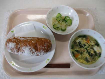 揚げパン 牛乳 にらたまスープ 大根ときゅうりのごま風味