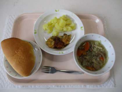 ショートニングパン 牛乳 魚のフライ こふきいも きのこと野菜のスープ