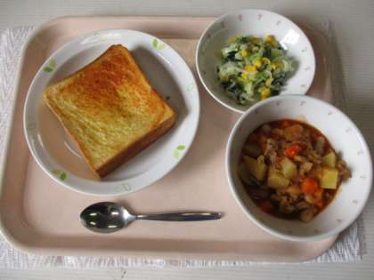 ガーリックトースト 牛乳 ポークビーンズ キャベツとほうれん草のサラダ