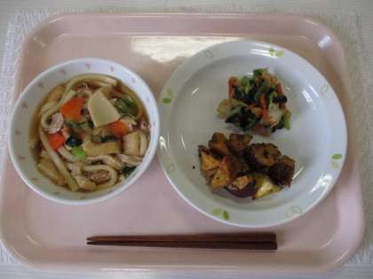 煮こみうどん 牛乳 大学いも 野菜のおかかかけ