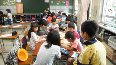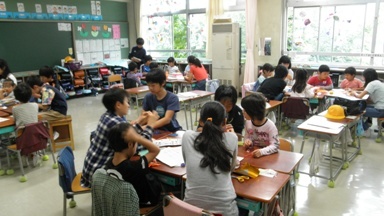 兄弟学級で七夕の飾りを作りました。写真は1年生と6年生がいっしょに飾りを作っている様子です。集会を通して、短冊などの願いごとは職員室前の廊下に飾りといっしょに掲示する予定です。