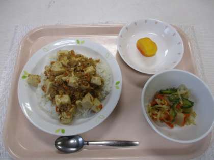 麻婆豆腐丼 牛乳 こんにゃくサラダ くだもの(柿)