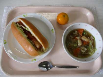 ホットドッグ 牛乳 白いんげん豆の田舎風スープ くだもの(みかん)