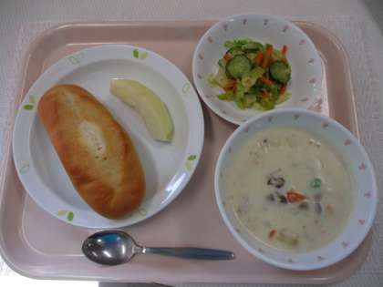 ソフトフランスパン 牛乳 クリームシチュー 野菜のイタリアンドレッシングかけ くだもの(りんご)