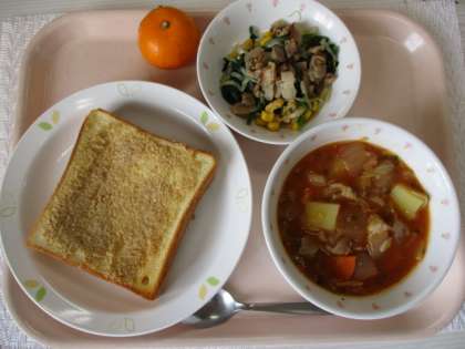 セサミトースト 牛乳 ボルシチ ほうれん草サラダ くだもの(みかん)