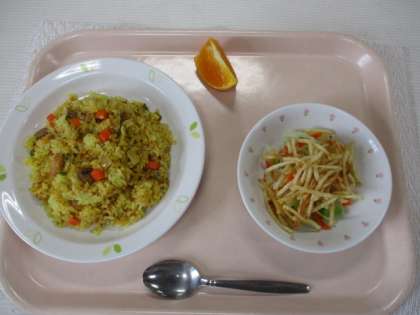 カレーピラフ 牛乳 じゃがいものハニーサラダ くだもの(たくみマドンナ)