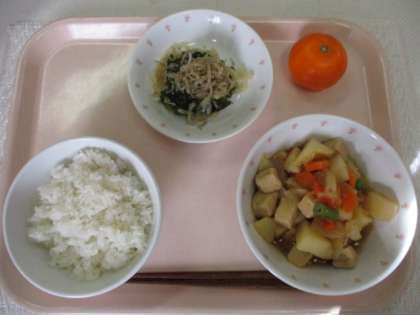 麦ごはん 鶏とじゃがいものうま煮 じゃこサラダ くだもの(盛田みかん)