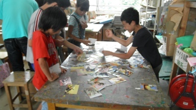 図工の授業をのぞくと、5年3組の子どもたちが楽しそうに写真を選んでいました。自分の好みの写真を自分で選んだ色画用紙に貼っていきます。たくさん中から写真を選んでいくうちに、その子ならではの個性ある作品ができていきます。