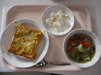 ツナコーントースト 牛乳 きのこと野菜のスープ フルーツヨーグルト