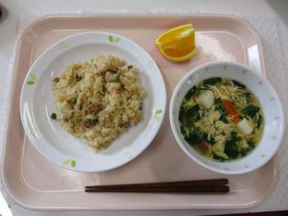 中華おこわ 牛乳 にらたまスープ くだもの(ネーブル)