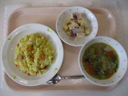 パエリア 牛乳 ベーコンと野菜のスープ シナモンポテト