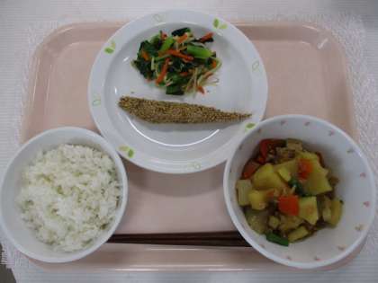 麦ごはん 牛乳 ししゃものごま焼き じゃがいものそぼろ煮 おひたし